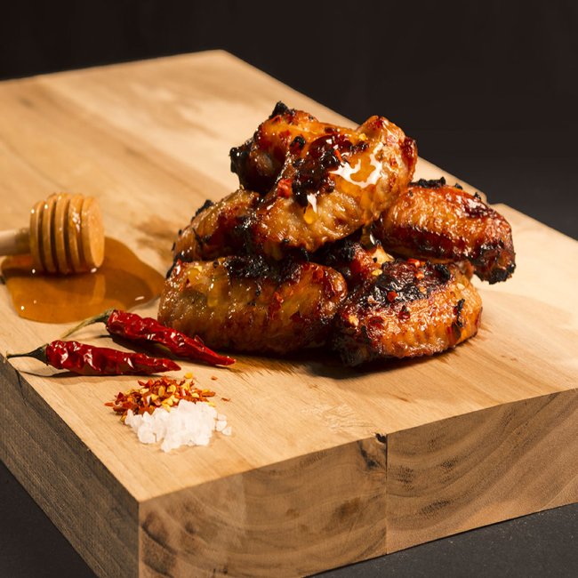 Adventure Menu Chicken Wings Honey & Chili: Tasty oven-roasted chicken wings marinated in a honey-chilli sauce. Golden and delicious with a sweet honey taste and fiery chilli finish.