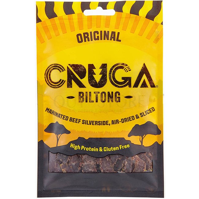 Delicious marinated and air-dried beef silverside slices with a perfect blend of spices, seasoned with sea salt, and a touch of sweetness. 70 g pack of Cruga Biltong Original.