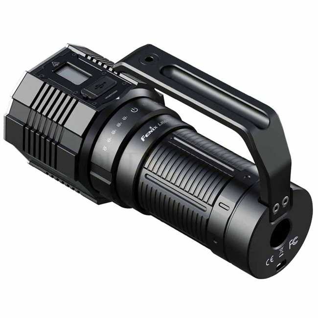 The Fenix LR60R merges a spotlight with flood lighting and delivers up to 21,000 lumens. It has a beam throw of approximately 1,085 meters in spot mode. A mechanical rotary dial enables rapid mode changes, while an OLED screen shows runtime, battery level, and selected mode. It is powered by a replaceable battery pack that can be USB‑C charged.