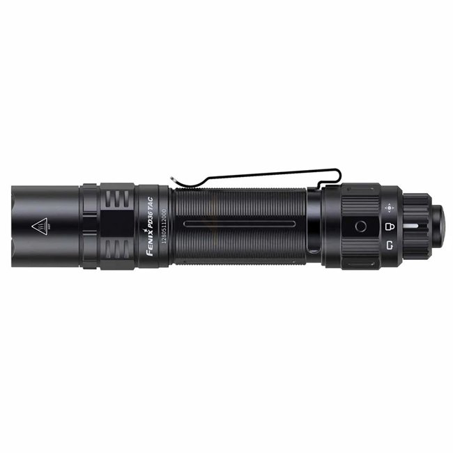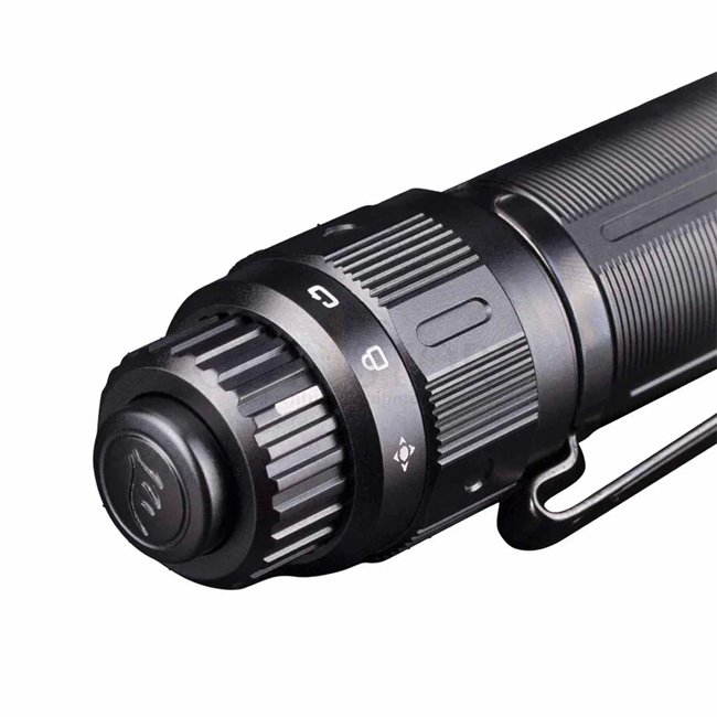 The Fenix PD36 TAC is the tactical variant in the PD series. It features a rotary tail switch to instantly toggle between Tactical mode (high output + strobe only) and Duty mode (full range of brightness levels + strobe). It is powered by a 21700 battery, reaching about 274 meters in beam throw.