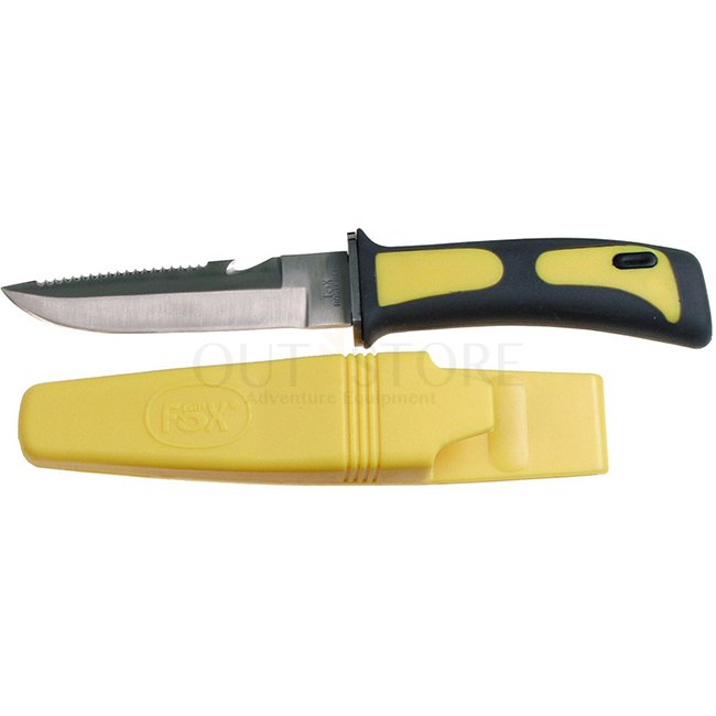 High-quality FoxOutdoor Diving Knife in Yellow; blade with smooth and serrated edge, belt cutter; rubber handle with holster locking device; comes with plastic sheath and adjustable straps for fixation. Total length: 23cm, Blade: 11.5cm, Weight: 140g (kni