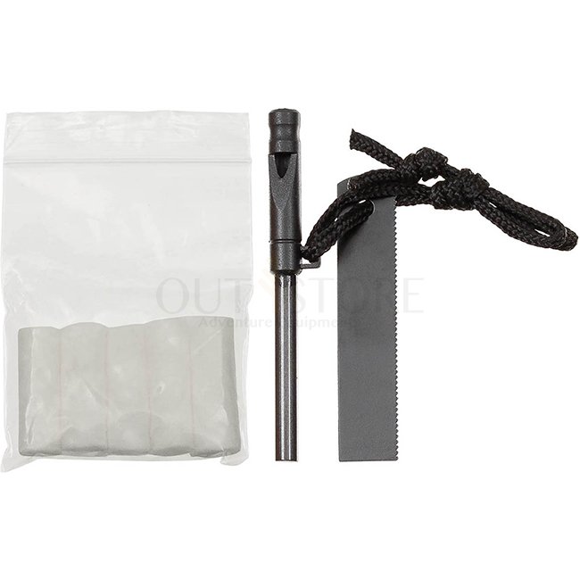 Protection against cold, wet, wind, and heat. Emergency sleeping bag kit including 1 sleeping bag, 1 fire starter with signal whistle, scraper, 5 cotton tinder pieces, transport bag with whistle. Dimensions: 210 x 90 cm, Pack size: 8 x 10 cm, Weight: 160