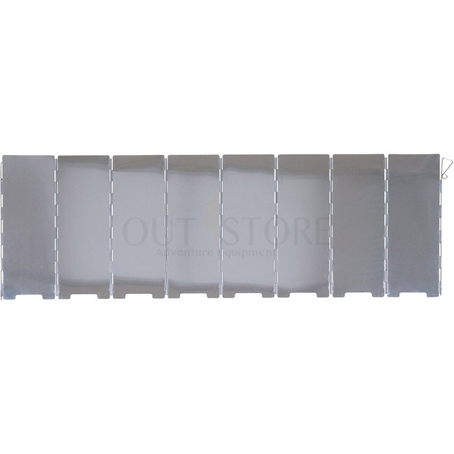 Windscreen for outdoor stoves, also as splatter guard. Features 2 ground brackets, includes transport bag. Made of 100% aluminium. Lightweight and foldable design.