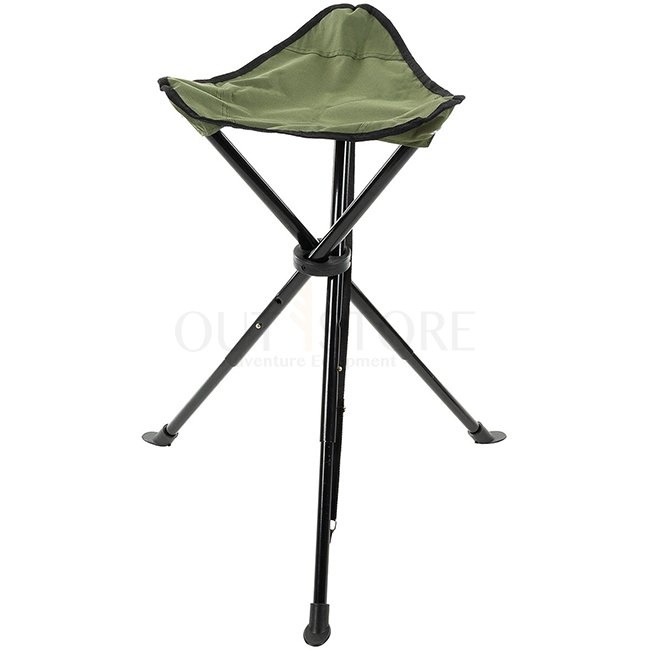 FoxOutdoor Folding Stool Telescopic Tripod - Olive: Sturdy metal frame, high stability, triangular seat surface, transport lock, and bag included. Seat height 45-55 cm, pack size 60 x 8 x 8 cm, weight 1.00 kg. Material: 100% Polyester cover, 100% Metal fr