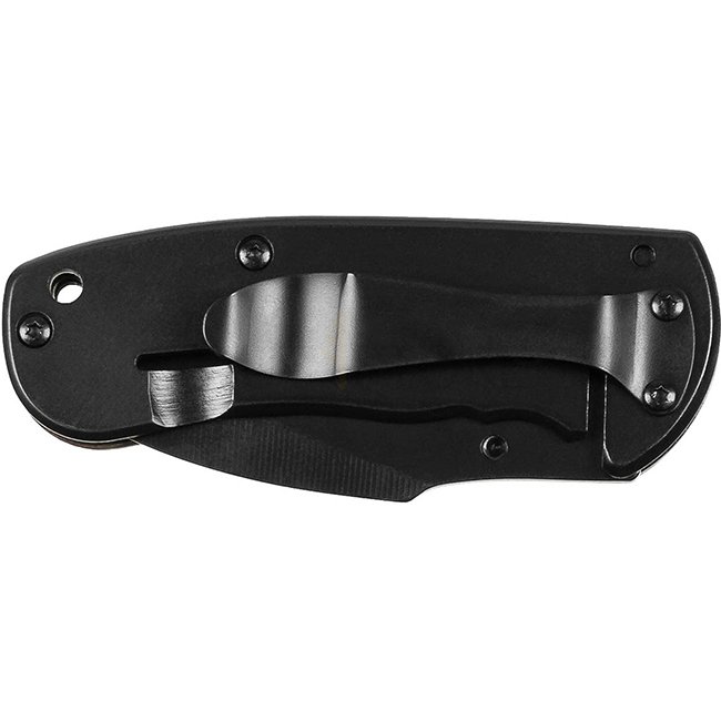 FoxOutdoor Jack Knife Compact: Blackened blade, smooth edge, thumb pin, linerlock, metal handle with wooden grip plate, fastening eyelet, metal belt clip. Total length: ca. 15cm. Blade: ca. 6cm. Weight: ca. 90g.