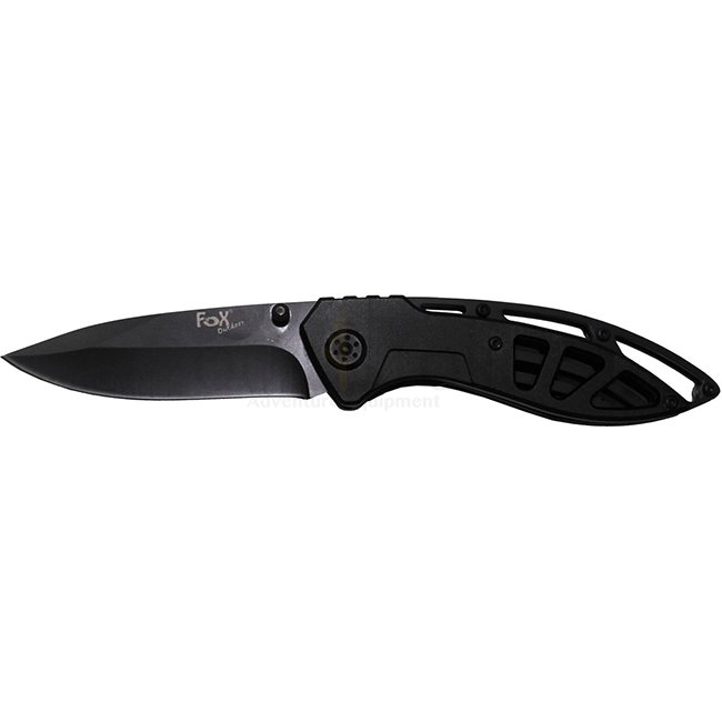 High-quality FoxOutdoor jack knife with a blackened blade, smooth edge, and double-sided thumb pin. Features a linerlock mechanism, perforated metal handle with thumb rest, and an ergonomically shaped design. Includes a metal belt clip for convenience. To