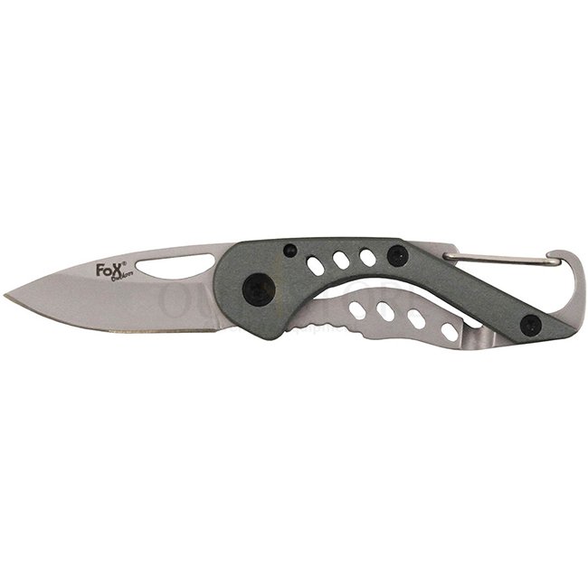 FoxOutdoor Jack Knife Piccolo - Silver: Perforated blade, linerlock, ergonomically shaped metal handle, carabiner, 11cm total length, 4cm blade, 30g weight.