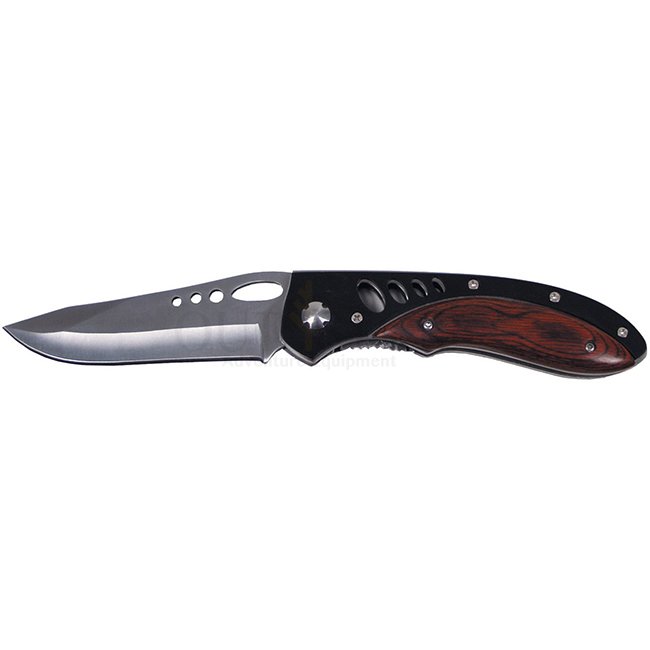 FoxOutdoor Jack Knife Wooden Insert - Black: Blade with smooth edge and perforations for easy opening. Linerlock, metal handle with wood inserts (wood grain and color may vary). Ergonomically shaped, 22.5 cm total length, 9.5 cm blade, 190 g weight.