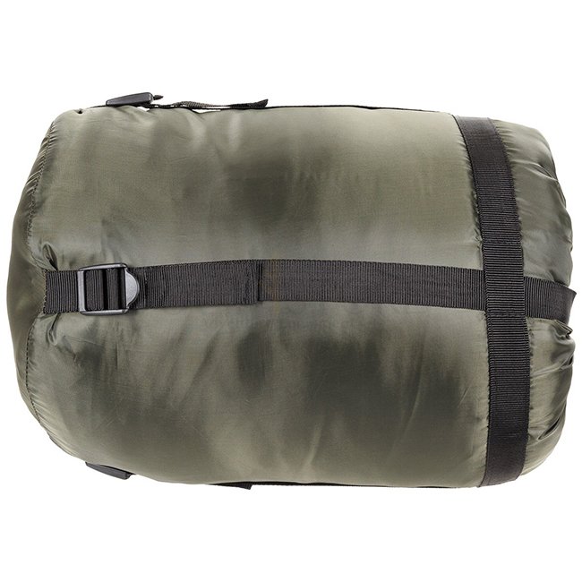 FoxOutdoor Mummy Sleeping Bag 2 Layer Filling - Olive. Temperature range: -10¯C to +15¯C. 2-layer filling. Compact size: 40 x 25 x 25 cm. Weight: 1.95 kg. Polyester material, hood-shaped head, 2-way zipper, drawstrings, draft collar, ventilation loops. Id