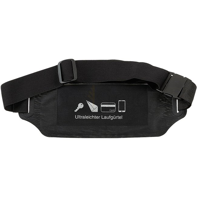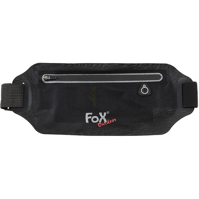 FoxOutdoor Running Belt - Black: Elastic nylon waist strap with click closure, water-resistant front pocket, waterproof zip, and headphone port. 100% Polyester (PU-coated).