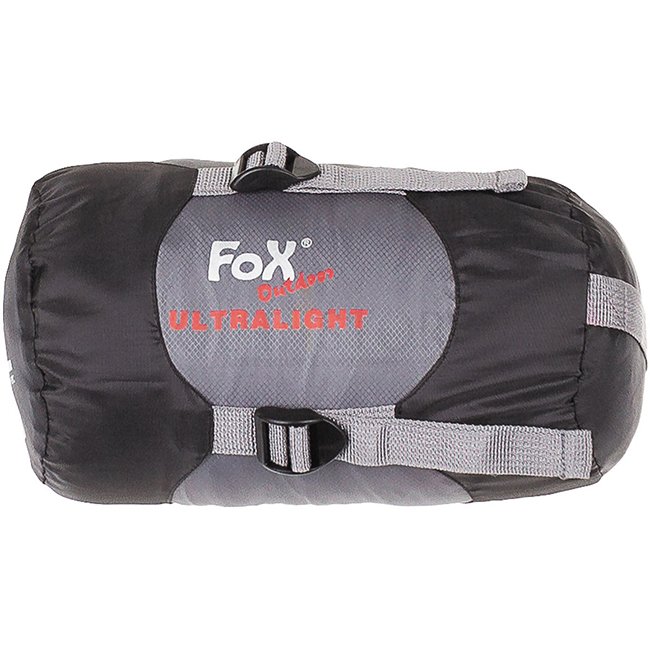 FoxOutdoor ultra light sleeping bag in black/grey, ideal for temperatures ranging from +11¯C to +21¯C. Features top 2-way zip with velcro, usable as a blanket, hood-shaped head part with drawstring, and adjustable shoulder area. Includes bottom loops for