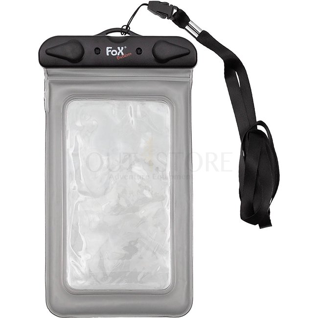 FoxOutdoor Smartphone Bag Waterproof - Black. Dust-tight and waterproof closure. Can use device through the case. Transparent windows: 14.5 x 8 cm. Detachable neckband. Overall dimensions: 12.5 x 22.5 x 2 cm. Weight: 60 g. Material: 100% PVC.