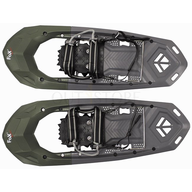 FoxOutdoor Snowshoes LUSEN - Olive feature a flexible plastic deck for excellent roll-off performance, lateral crampons for safe side-hill crossings, robust front teeth for superior traction, good grip on ascent and descent, a one-handed quick-release fas