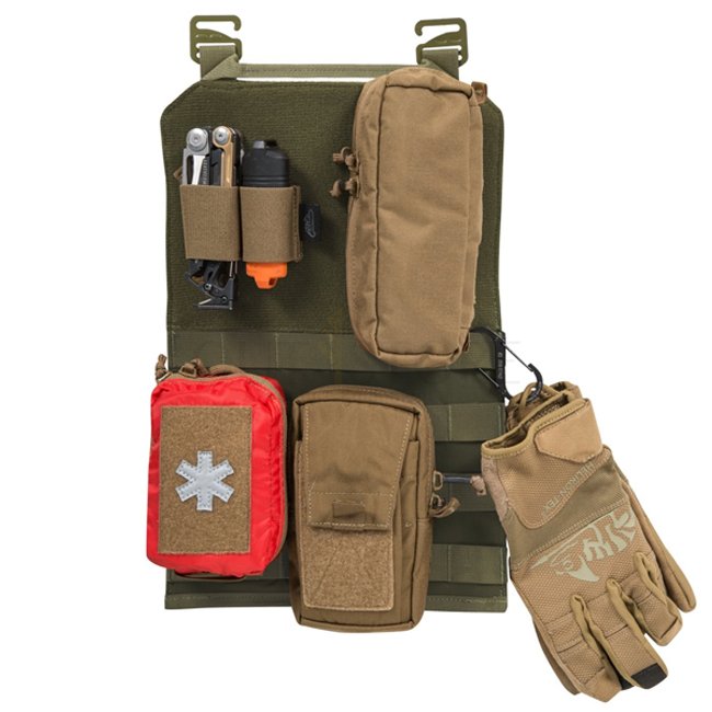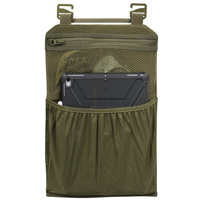 Helikon-Tex Backpack Panel Insert in Olive Green - Large organizer with handle, velcro panel, zippered pocket, and elastic cuffs. Compatible with various backpacks and car seats. Features A4 format, loop panel, two pockets, mountable via G-hooks. Made of