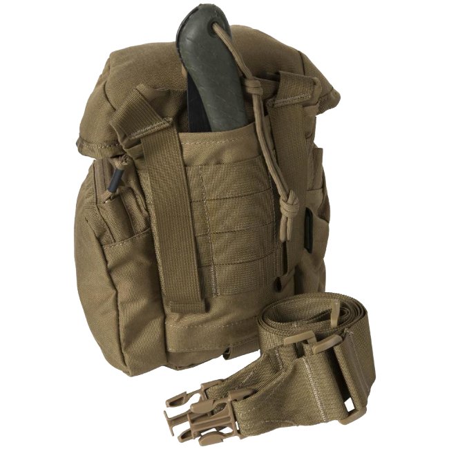 The Essential Kitbag® was designed to hold all bushcraft/survival essentials. This bag can hold a water bottle with cup, folding stove, flashlight, compass, cord, sewing kit etc. all neatly organized in separate pockets. On the back is a sleeve that will hold a folding saw, knife or an axe and extra pouches can be attached at the front side via MOLLE. The Essential Kit Bag can be carried attached to backpack or belt via MOLLE/PALS or with its own shoulder strap.