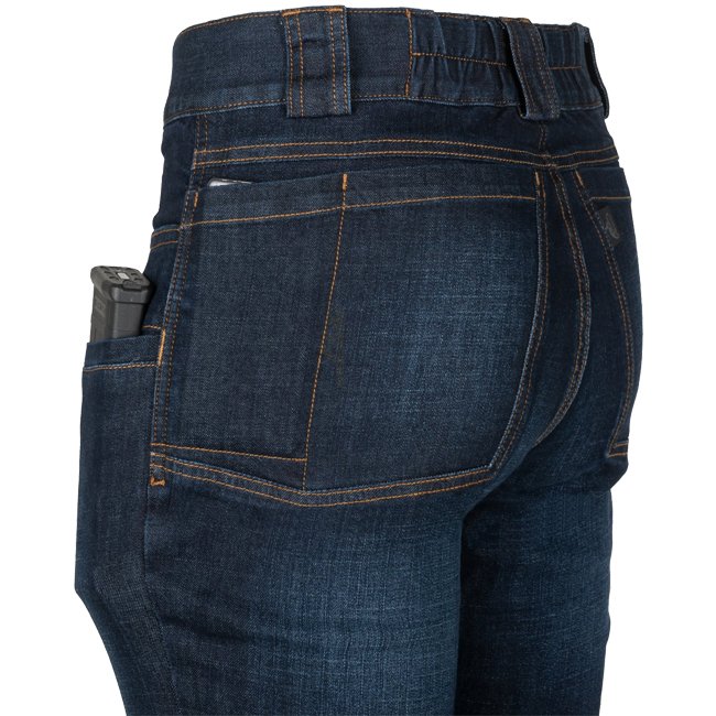 Helikon-Tex Greyman Tactical Jeans Slim in Denim Mid Dark Blue, 2XL Regular. Slim version of popular tactical jeans with crotch gusset for ease of movement. Elastic belt with hook&loop closure, 9 pockets for essentials.