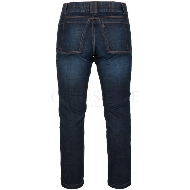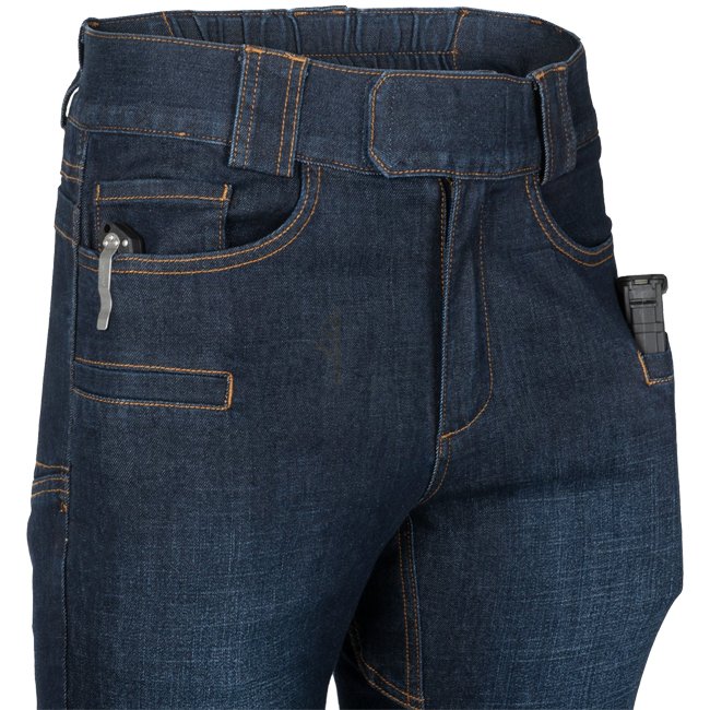 Helikon-Tex Greyman Tactical Jeans Slim - Denim Mid Dark Blue - XL - Long. Slim version of popular tactical jeans with crotch gusset, elastic belt, nine pockets, and durable 10 oz. denim material.