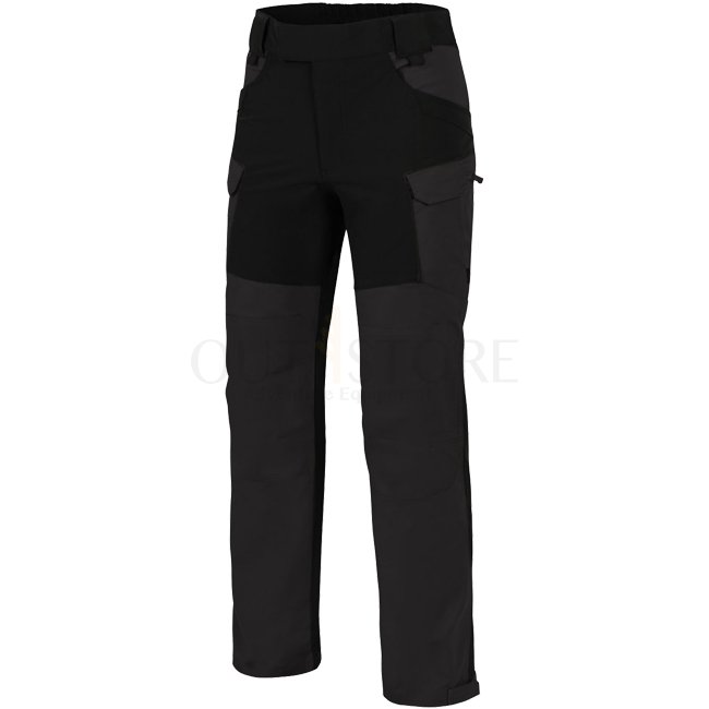 Comfortable and durable Helikon-Tex Hybrid Outback Pants in Ash Grey/Black A, 3XL-Short size. Hybrid construction for durability, wax-impregnable, anatomical cut, reinforced pockets, knee reinforcements, and leg cuff adjustment. Ideal for outdoor activiti
