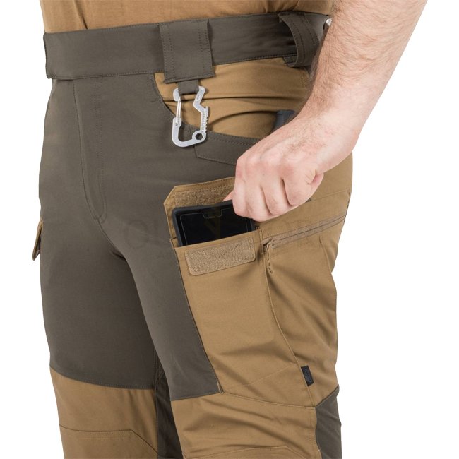Comfortable and durable Helikon-Tex Hybrid Outback Pants. Waterproof with wax, classic front pockets, hook&loop thigh pockets, zippered cargo pockets. Hybrid construction, wax-impregnable, anatomical cut, reinforced pocket edges, knee reinforcements, leg