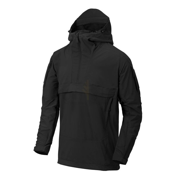 Helikon-Tex Mistral Anorak Jacket - Black - 3XL: High-performance anorak jacket made of StormStretch fabric with loop panel for personalization. Features a large kangaroo pocket, adjustable hood, bicep pockets, elbow reinforcements, ventilation zippers, a