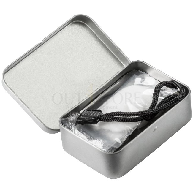 • Set includes: steel survival box (dimensions: 93 x 62 x 27 mm), a fire starter with a striker, two fuel tablets and cotton wool