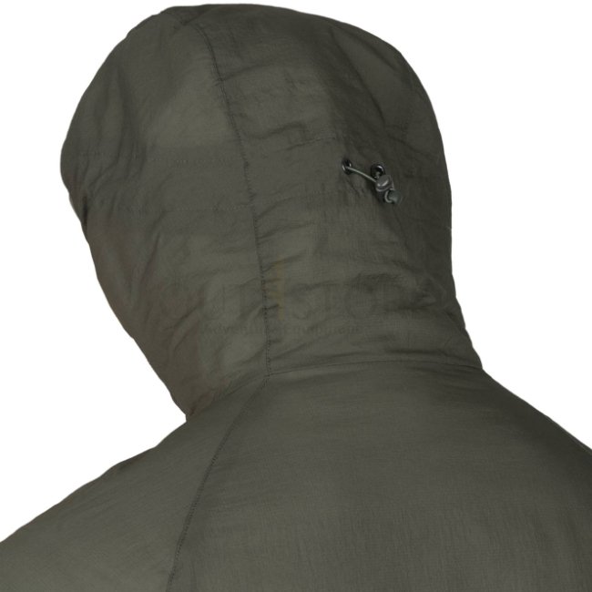 Lightweight and packable hoodie with WindPack nylon outer layer, Climashield Apex padding, multiple zippered pockets, and YKK zippers. Adjustable hood and loop panel for personalization. 100% Nylon outer material and 100% Polyester insulation. 460g.