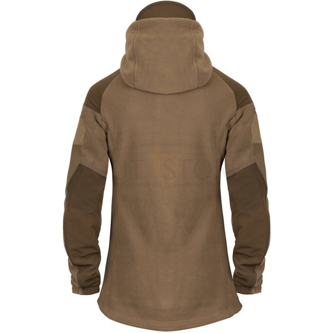 Stylish Helikon-Tex Women's Cumulus Heavy Fleece Jacket in Coyote color, tailored for females with anatomical cut and improved details. Features YKK zippers, zippered pockets, patch panels, hood with visor, and more. Perfect for outdoor activities.