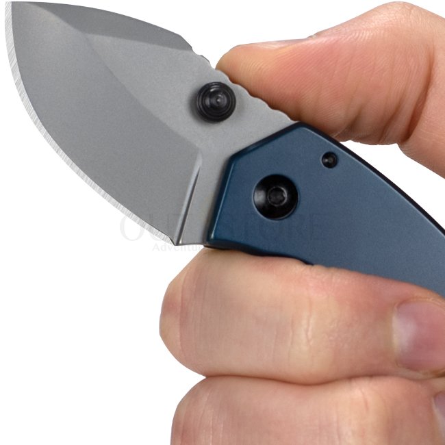 Compact and versatile, the Kershaw Antic Framelock Folder - Blue features an oversized ring for enhanced ergonomics and a multifunctional design. It doubles as a karambit-style grip with a flat head screwdriver, mini prybar, and a cleverly placed bottle o