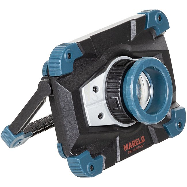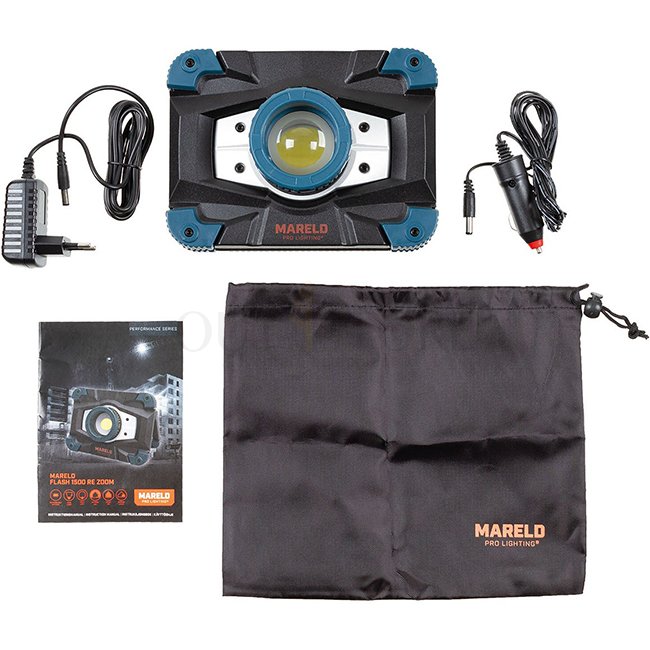 Compact LED work lamp with zoom function also perfect for camping 2 lighting modes impact-resistant, splash-proof solid aluminium body carrying handle rotatable up to 180° and usable as supporting foot USB output as powerbank and battery indicator on the backside incl. charger, car charger and bag Brightness: 1500 Lumens Power: 20 Watt Charging time: ca. 4 h Dimensions: ca. 18,5 x 13,5 x 7 cm