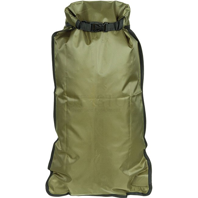 MFH Duffle Bag - Waterproof Ripstop 10L in Olive. Flap opening, roll-and-click closure with D-ring, 30cm diameter, 60cm height, 140g weight. Made of 100% Polyester.