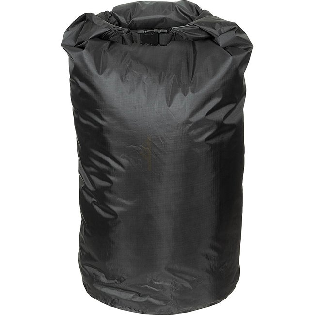 A waterproof MFH Duffle Bag with 110 l capacity in Black color. Features roll-and-click closure, reinforced seams, and made of durable ripstop material. Diameter: 40 cm, Height: 90 cm, Weight: 540 g. Ideal for outdoor adventures or travel.