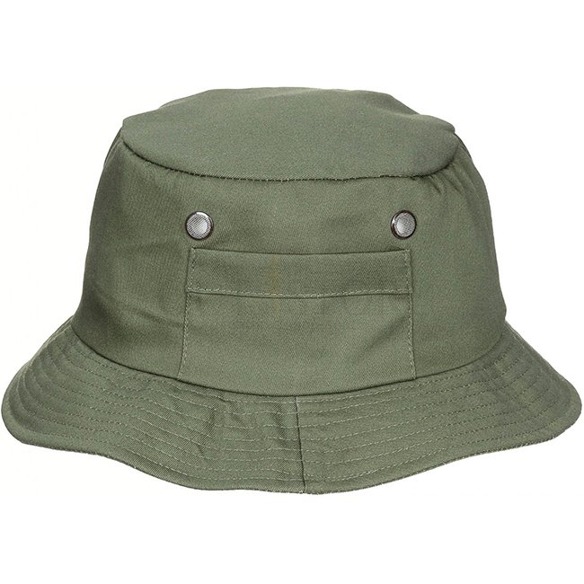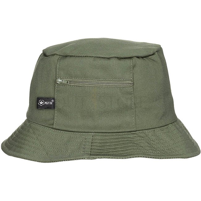 MFH Fisher Hat - Olive - 63: Classic fisher hat with left pocket, right pocket with zip, ventilation eyelets, 65% Polyester, 35% Cotton.