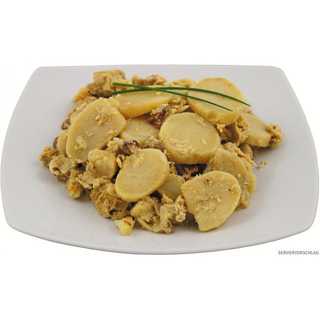 Handmade from local ingredients in Germany without preservatives and flavour enhancers no mechanically seperated meat processed store dry at room temperature gluten free Ingredients : potatoes 75%, bacon 10%, egg/milk 10%, onion, stone salt, pepper, sugar Nutritional values per 100 g: energy in kJ/kcal: 435/104 fat 4,77 g, of which saturates 1,39 g carbohydrates 12,16 g, of which sugars 0,81 g protein 2,79 g salt 0,54 g Content: 400 g