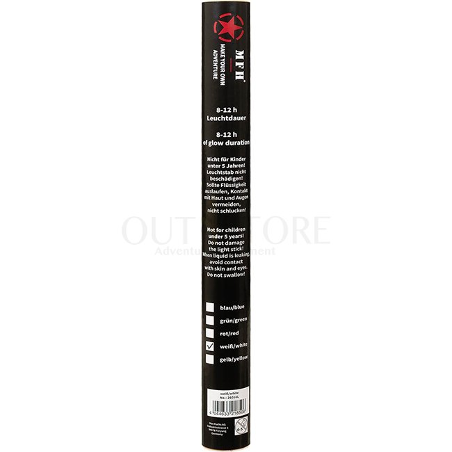 A versatile and reliable illuminating accessory, the MFH Glow Stick 35cm in White is the larger version of item no.: 26014. Activated by bending, it serves countless applications such as emergency or signal lighting, path marking, and even underwater illu