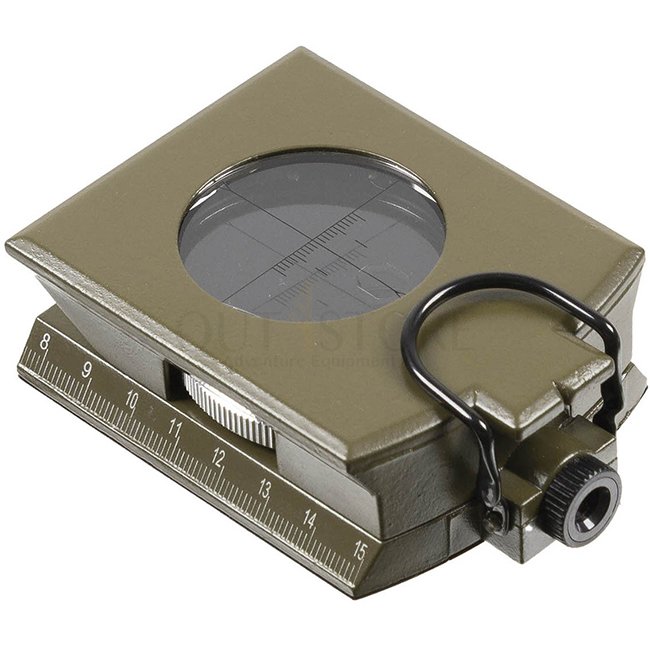 Liquid-damped rotatable housing compass. Fluorescent markings, magnifier, and clinometer included. Compact size: 10 x 6.5 x 3 cm. Ideal for outdoor navigation.