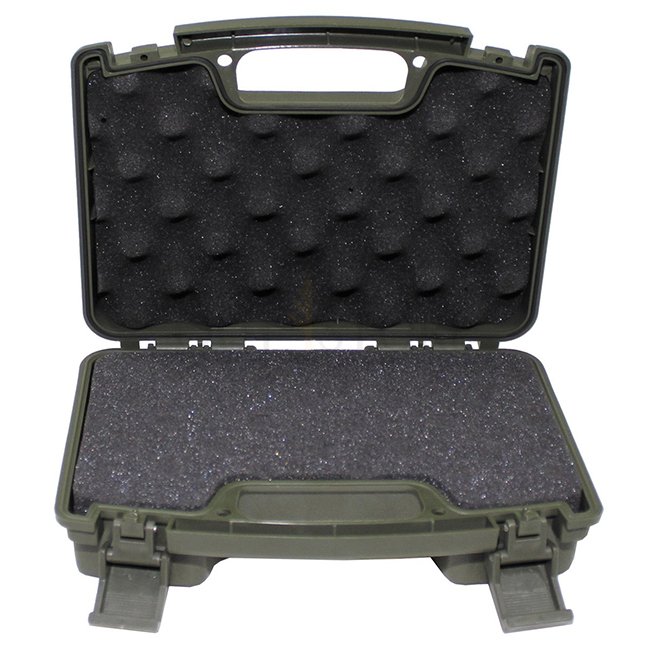Protect your pistol in style with the MFH Lockable Plastic Pistol Case in Olive. Shockproof plastic, secure snap locks, and a splash-proof design offer ultimate protection for your firearm. The case features a foam-padded lid with rubber seal, a convenien