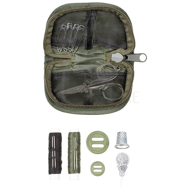 Compact D-shaped sewing kit with essential supplies for quick repairs. Includes 2 thread spools, 4 sewing needles, 4 safety pins, 2 spare buttons, 1 thimble, 1 threading help, and 1 pair of scissors. Perfect for on-the-go fixes. Dimensions: 11 x 7 x 2.5 c