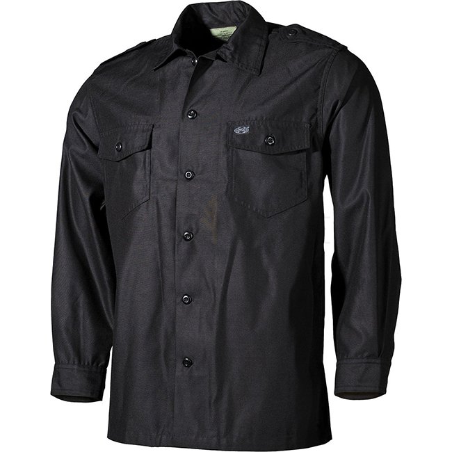 MFH US Shirt Long Sleeve in Black - L. Buttonhole placket, 2 patch chest pockets, button cuffs, epaulettes. 65% Polyester, 35% Cotton.