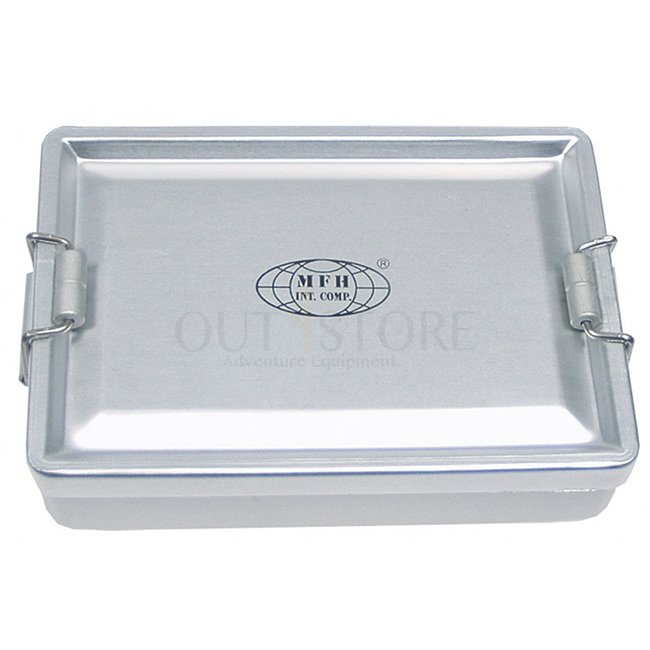 MFH Waterproof Aluminium Box - Waterproof aluminium box with rubber seal, lateral closure, and versatile handle. Dimensions 13.3 x 9.2 x 3.4 cm, weight approximately 100 g.