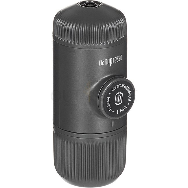 NanoPresso Espresso Machine - Grey: Portable espresso machine, manual operation, compact design, easy to use and clean. Includes watertank, pump, portafilter, filter basket, scoop, and cleaning brush. Dimensions: 16 x 7 cm, weight: 340 g.