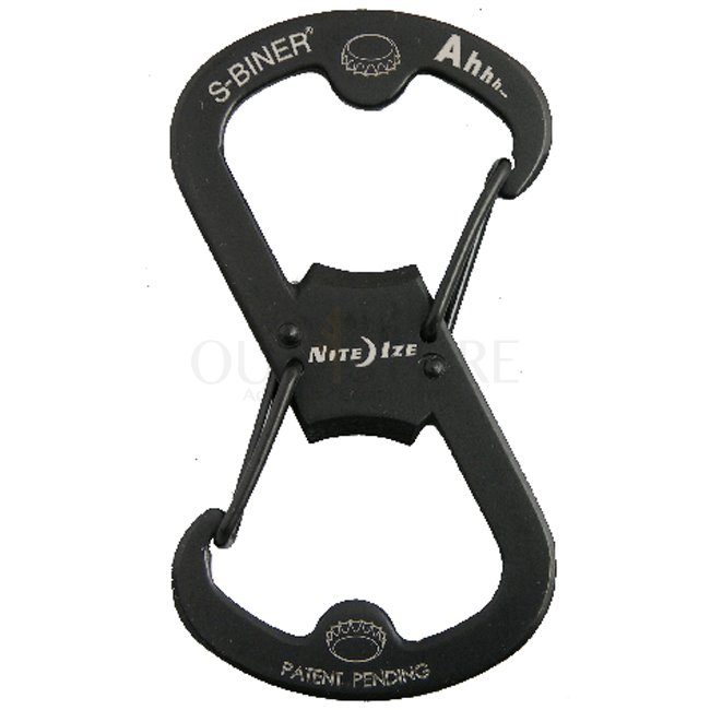 A multifunctional S-Biner with built-in bottle openers on both ends - Nite Ize Ahhh... Stainless Bottle Opener in Black.