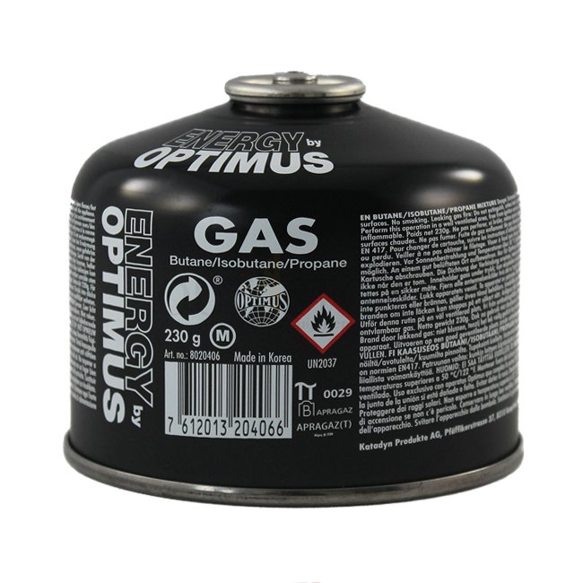 Optimus Gas 230g Butane/Isobutane/Propan. Premium blend for optimal stove performance. Smart seal protects canister. 230g size suitable for outdoor adventures.