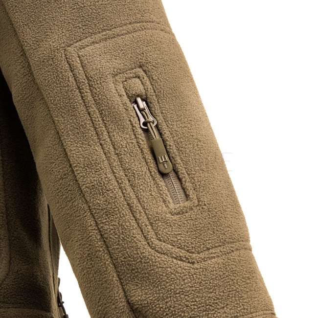 The jacket can be worn on its own or as an insulation layer under a water- / windproof outer cover. Thanks to the heavy double fleece material and the spacious cut, it keeps the wearer comfortably warm at all times. The two hook & loop surfaces on the upper arms have a vertical separation, which helps that the loop material can ergonomically wrap around the upper arm.