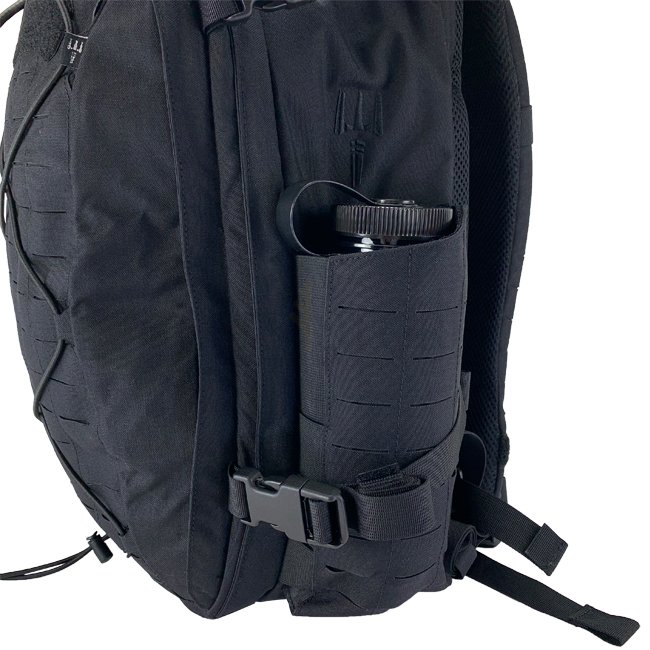 A large laser-cut surface permits the installation of MOLLE-system based pouches onto the backpack to further extend its capacity. Optionally, a shock cord zig-zags the entire back side creating a net to hold light objects such as a jacket. On the top it is held in place by a hook with quick detachable abilities and on the bottom the shock cord can be looped thru an eyelet and fastened by a cord stopper.