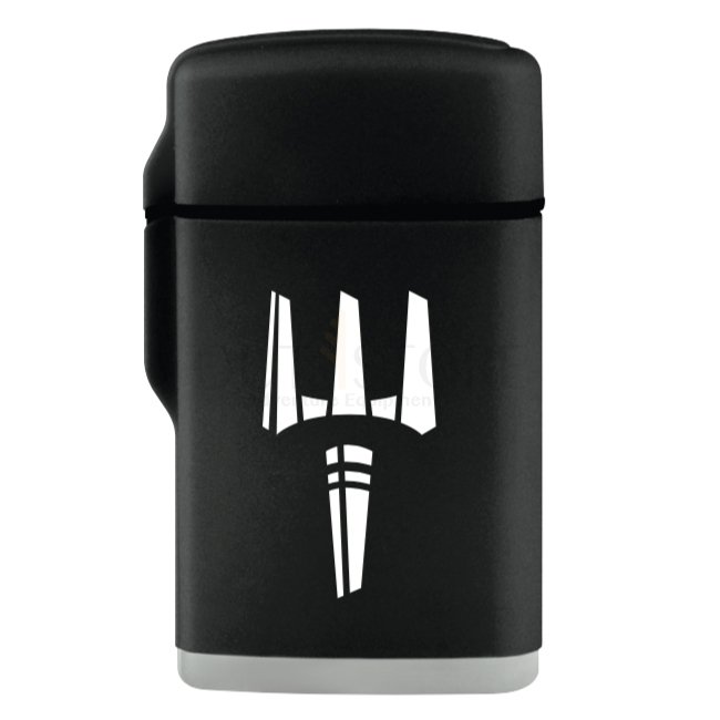 Pitchfork Storm Pocket Lighter - Black: Original ZORR windproof jet flame lighter with adjustable micro burner up to 1300°C. Gas-refillable, non-reflective black matte finish, soft grip surface, and lightweight design. Quiet open/close secure cap. Shippin