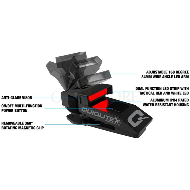 Introducing QuiqLite X2 USB Rechargeable Aluminum Housing - Red / White. Features include new aluminum housing, USB rechargeability, 4 modes with different lumens, anti-reflective anodize finish, adjustable LED arm, magnetic housing, rotating magnetic Qui