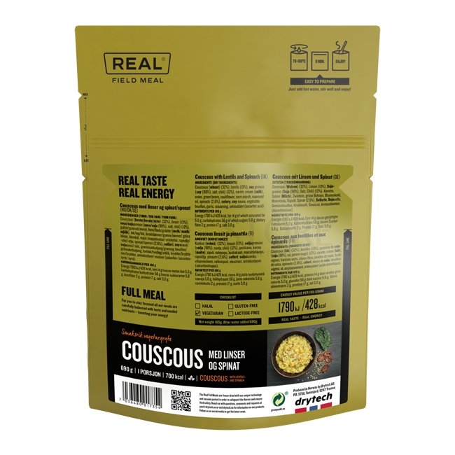 In order to perform during challenging conditions you have to make sure your diet is well balanced, with a sufficient amount of carbs, fat and protein. REAL Field Meal is made by a skillful team of chefs, securing you a nutritious and lightweight meal – easy to prepare and rich in natural flavour.