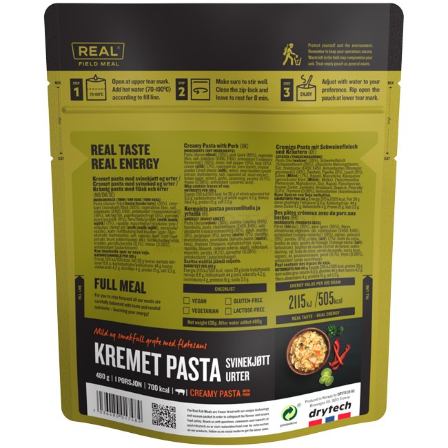 REAL Full Meal Creamy Pasta with Pork - Nutritious & Lightweight Meal Made for Challenging Conditions, 700 kcal Per Portion.