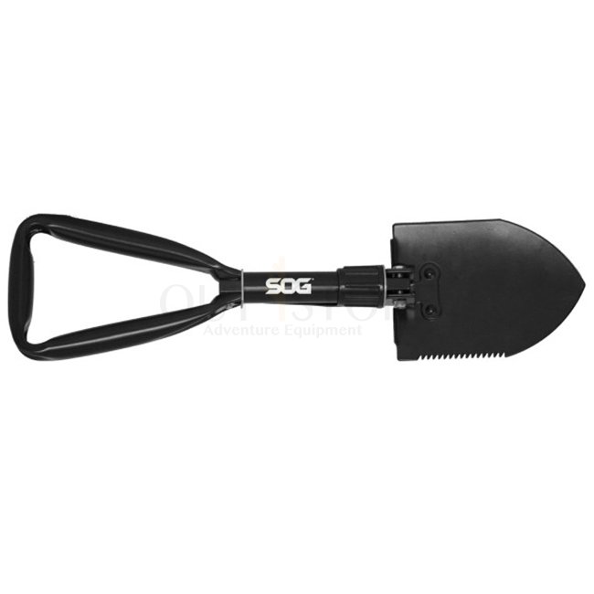 SOG Entrenching Tool - Black: Compact and durable e-tool perfect for outdoor activities. Features serrated edge and easy-to-use locking mechanism. Ideal for camping, hiking, and survival situations.