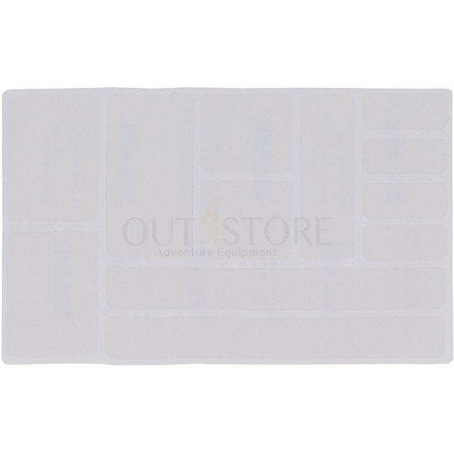 12-part set of patches for quick repair of e.g. outdoor clothing, tents, bags consists of: 4 small patches ca. 4 x 2 cm 2 square patches ca. 4,2 x 4,2 cm 2 long patches ca. 15,5 x 2,5 cm 4 rectangular patches: 2 x ca. 7 x 4,2 cm 1 x ca. 8,7 x 4 cm 1 x ca. 8,7 x 2,5 cm adheres on nearly all kinds of materials clean the damaged spot and press on the patch firmly